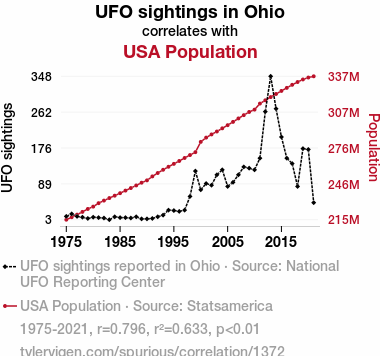 Your research team used data from National UFO Reporting Center and Statsamerica to assess this nagging question. You found a correlation coefficient of 0.7956561 and p < 0.01 for 1975 to 2021.