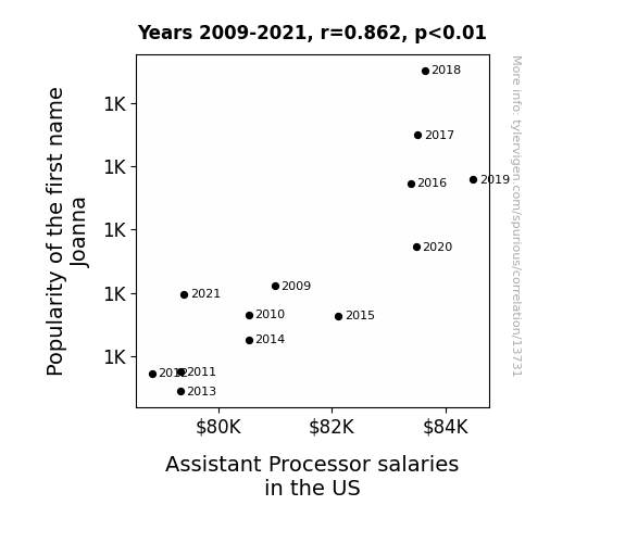 This means 74.4% of the change in the one variable (i.e., Assistant Processor salaries in the US) is predictable based on the change in the other (i.e., Popularity of the first name Joanna) over the 13 years from 2009 through 2021.