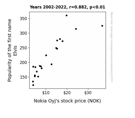 This means 77.7% of the change in the one variable (i.e., Nokia Oyj's stock price (NOK)) is predictable based on the change in the other (i.e., Popularity of the first name Elvis) over the 21 years from 2002 through 2022.