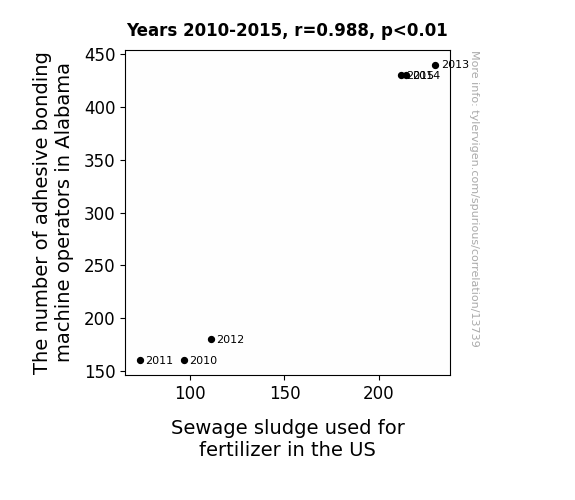 This means 97.7% of the change in the one variable (i.e., Sewage sludge used for fertilizer in the US) is predictable based on the change in the other (i.e., The number of adhesive bonding machine operators in Alabama) over the 6 years from 2010 through 2015.