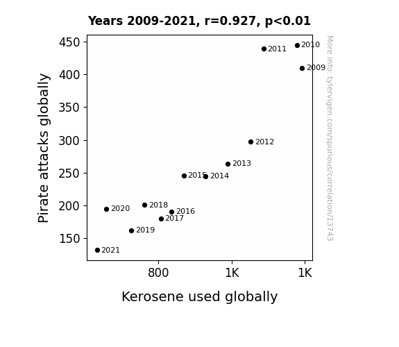 This means 85.9% of the change in the one variable (i.e., Kerosene used globally) is predictable based on the change in the other (i.e., Pirate attacks globally) over the 13 years from 2009 through 2021.