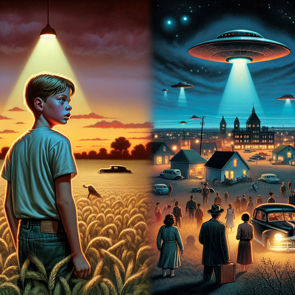 ChatGPT: In a bustling Missouri town, a boy named Mason, who is popular among his peers, stands in a field under the evening sky. In the background, a UFO hovers mysteriously, catching the attention of the entire town, while Mason looks on with wonder.