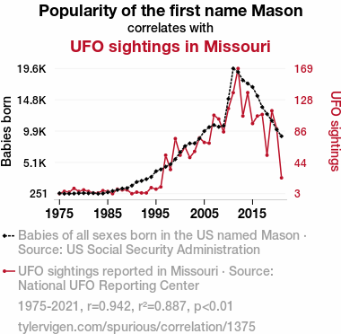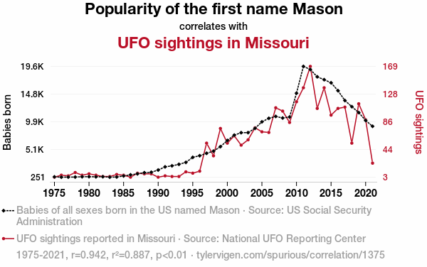 This means 88.7% of the change in the one variable (i.e., UFO sightings in Missouri) is predictable based on the change in the other (i.e., Popularity of the first name Mason) over the 47 years from 1975 through 2021.