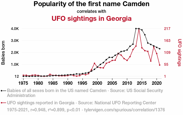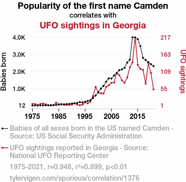 This means 89.9% of the change in the one variable (i.e., UFO sightings in Georgia) is predictable based on the change in the other (i.e., Popularity of the first name Camden) over the 47 years from 1975 through 2021.