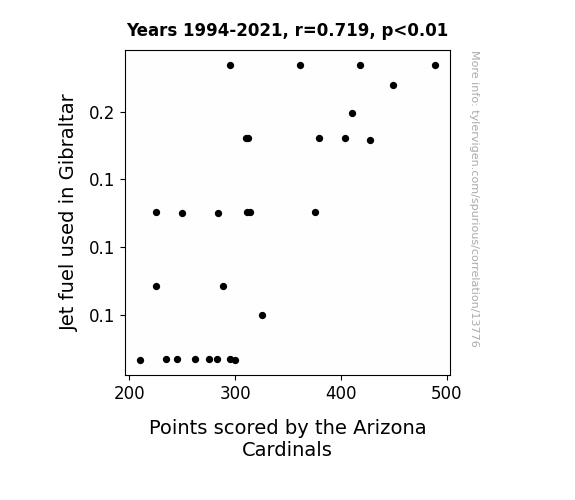 This means 51.7% of the change in the one variable (i.e., Points scored by the Arizona Cardinals) is predictable based on the change in the other (i.e., Jet fuel used in Gibraltar) over the 28 years from 1994 through 2021.