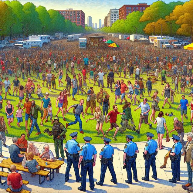 ChatGPT: Generate an image that captures the bustling atmosphere of a crowded New York City park. In the foreground, depict a group of friends gathered around a food stand, with a man named Corey at the center, surrounded by a circle of people, all chatting and laughing animatedly. In the mid-ground, show the park filled with lively activities and people enjoying the day. In the background, depict a group of police officers arresting a cluster of thieves who attempted to rob a store, a few bustling streets away. This should be an engaging and realistic scene that captures the energy and contrast of city life.