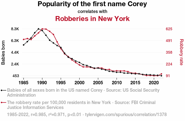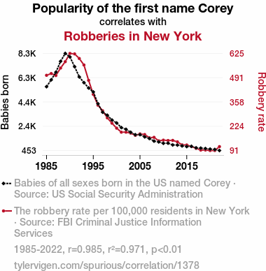 - The spurious research paper: The Corey Crime Connection: An Analysis of the Impact of the Name Corey on Robberies in New York