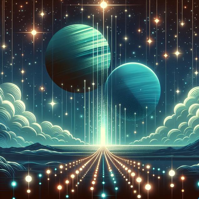 Prompt: An image that looks like it is a scene from a Disney Movie, depicting a serene night sky with two celestial bodies standing out - the blue-green planet Uranus and the deep blue Neptune, aligned in a breathtaking straight line. The stars twinkle around them, providing a magical backdrop. Below, a digital ticker tape displays the stock price of Crown Castle, steadily rising like a ladder reaching for the stars, adding an element of wonder and possibility to the scene. The depiction should include only scenes, people, and objects, it should not include text or speech bubbles.