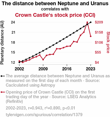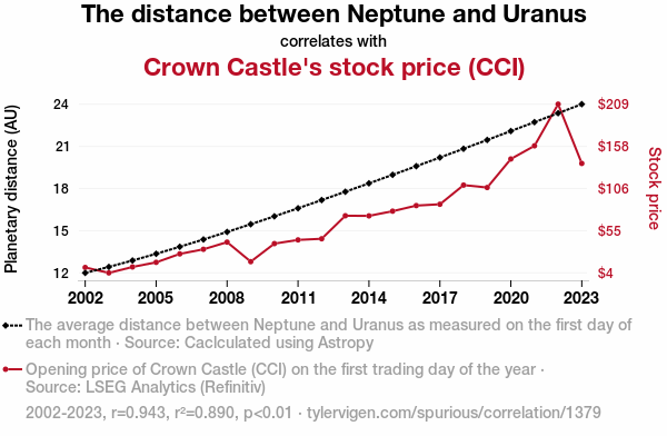 This means 89% of the change in the one variable (i.e., Crown Castle's stock price (CCI)) is predictable based on the change in the other (i.e., The distance between Neptune and Uranus) over the 22 years from 2002 through 2023.