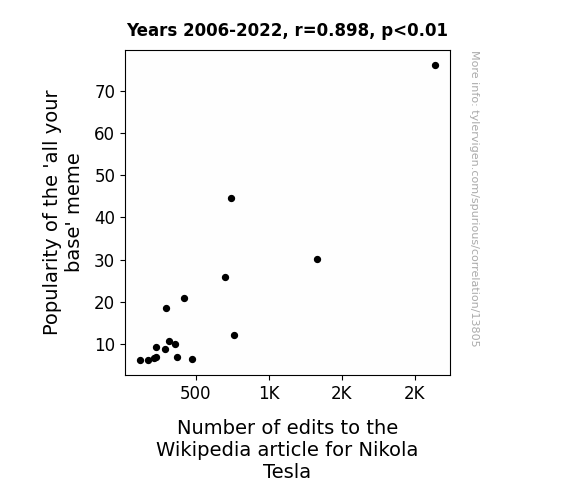 This means 80.6% of the change in the one variable (i.e., Number of edits to the Wikipedia article for Nikola Tesla) is predictable based on the change in the other (i.e., Popularity of the 'all your base' meme) over the 17 years from 2006 through 2022.