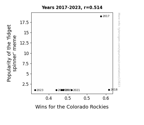 This means 26.4% of the change in the one variable (i.e., Wins for the Colorado Rockies) is predictable based on the change in the other (i.e., Popularity of the 'fidget spinner' meme) over the 7 years from 2017 through 2023.
