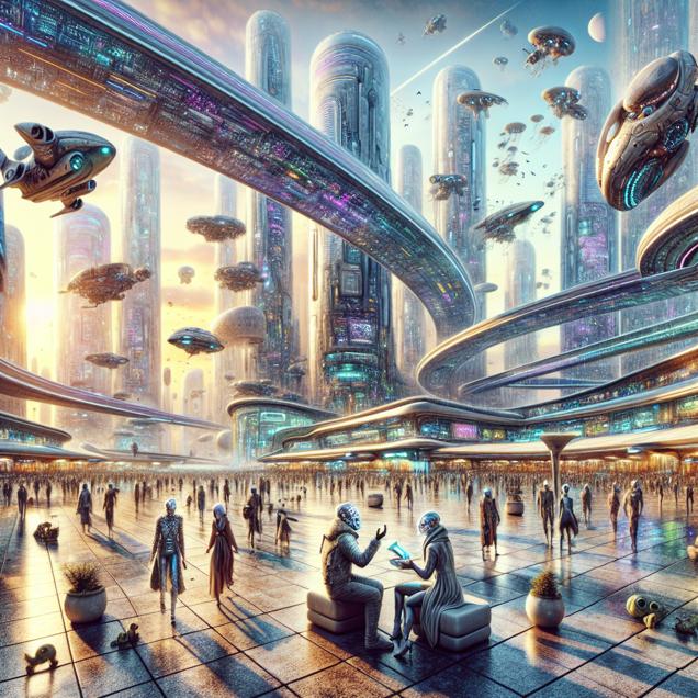 Prompt: [A detailed image that resembles a bustling town square within the 'Star Wars' universe. The scene is set on the planet Coruscant, with towering buildings and flying speeders in the background. In the center of the square, a holographic billboard prominently showcases the name "Theodore" in a sleek, futuristic font. Adjacent to it, a vibrant digital ticker displays the fluctuating stock price of a galaxy-wide conglomerate, casting an iridescent green glow across the plaza. Amidst the alien species milling about, a humanoid figure dressed in intergalactic attire can be seen engrossed in conversation, gesturing excitedly as they discuss the trending name and the prosperity of the corporation.] The depiction should include only scenes, people, and objects, it should not include text or speech bubbles.
