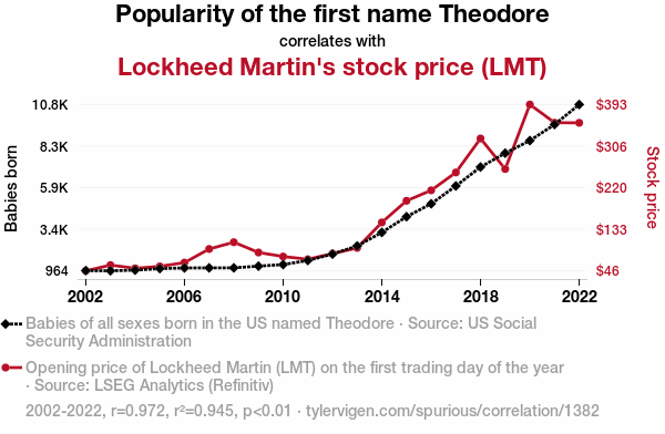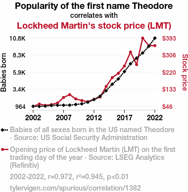 User prompt: Please provide potential search keywords for a paper titled Shoot for the Stars: The Lockheed Martin Theodore Connection with an abstract of This study explores the intriguing link between the popularity of the first name Theodore and the stock price of Lockheed Martin Corporation (LMT). By analyzing data from the US Social Security Administration and LSEG Analytics (Refinitiv), we aimed to shed light on whether the name Theodore holds any sway over the aerospace and defense company's stock performance. Our findings revealed a surprising correlation coefficient of 0.9723459 and statistically significant p-value of less than 0.01 for the period spanning 2002 to 2022. This unexpected correlation sparks discussions on the potential influence of Theodore's popularity on LMT's stock price, raising questions about the impact of nomenclature on financial markets. Our research not only offers a lighthearted take on the intersection of name popularity and stock movements but also presents intriguing possibilities for future investigation in the fields of finance and sociology.