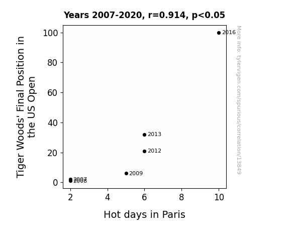This means 83.6% of the change in the one variable (i.e., Hot days in Paris) is predictable based on the change in the other (i.e., Tiger Woods' Final Position in the US Open) over the 6 years from 2007 through 2020.