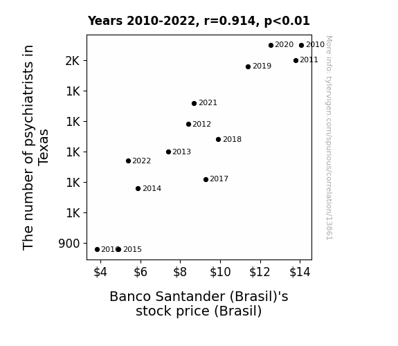 This means 83.5% of the change in the one variable (i.e., Banco Santander (Brasil)'s stock price (Brasil)) is predictable based on the change in the other (i.e., The number of psychiatrists in Texas) over the 13 years from 2010 through 2022.