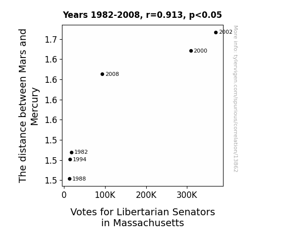 This means 83.4% of the change in the one variable (i.e., Votes for Libertarian Senators in Massachusetts) is predictable based on the change in the other (i.e., The distance between Mars and Mercury) over the 6 years from 1982 through 2008.