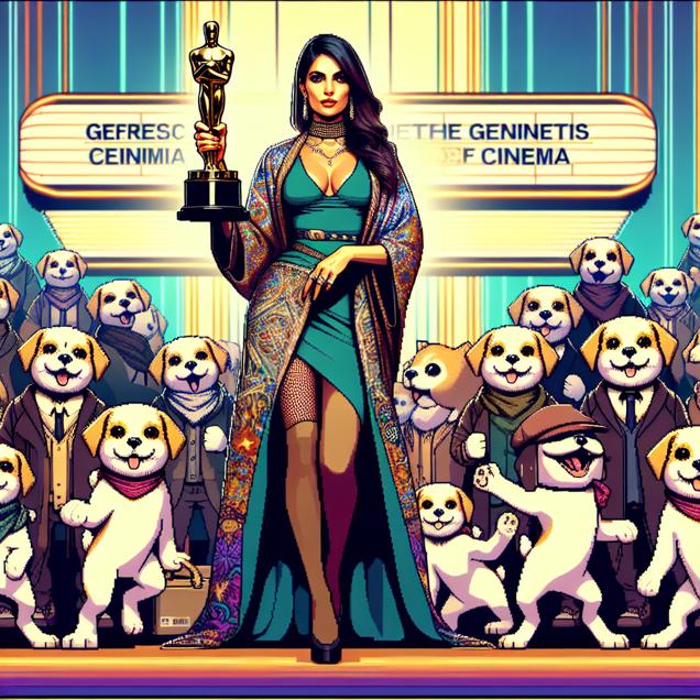 ChatGPT: Generate an image of a Cyber folk woman in her late 30s standing proudly with an Oscar statuette in her hand. She exudes confidence and glamour. Surrounding her are multiple animated dog characters from various direct-to-video Scooby Doo films, each in a playful and lively manner. The scene captures the whimsical interaction between the woman and the animated dogs, with a futuristic and folk-inspired cyber backdrop.