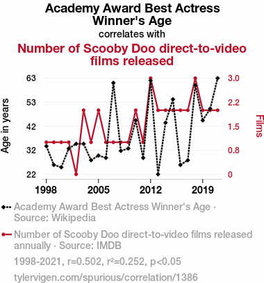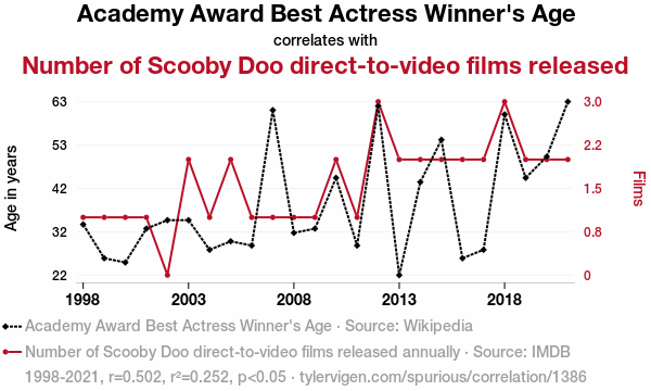 A linear line chart with years as the X-axis and two variables on the Y-axis. The first variable is Academy Award Best Actress Winner's Age and the second variable is Number of Scooby Doo direct-to-video films released.  The chart goes from 1998 to 2021, and the two variables track closely in value over that time. Small Image