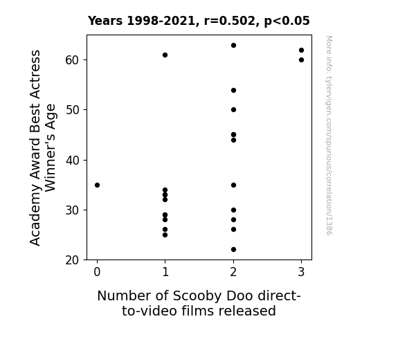 User prompt: Please provide potential search keywords for a paper titled The Age of Role: Unveiling the Silver Screen Scooby Doo Connection with an abstract of This study investigates the peculiar yet intriguing relationship between the age of Academy Award Best Actress winners and the number of Scooby Doo direct-to-video films released from 1998 to 2021. Utilizing data sourced from reputable platforms such as Wikipedia and IMDB, our research team embarked upon this whimsical exploration. The correlation coefficient of 0.5017053 and p < 0.05 uncovered a surprising association, raising eyebrows and leaving us both scratching our heads and chuckling. It appears that as the age of the Best Actress winners increases, so does the number of Scooby Doo direct-to-video films released. This research contributes a playful yet thought-provoking dimension to the world of cinematic analysis and statistical investigation.