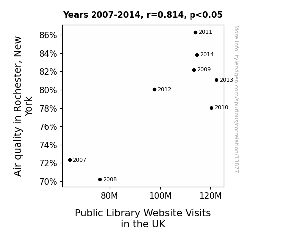 This means 66.3% of the change in the one variable (i.e., Public Library Website Visits in the UK) is predictable based on the change in the other (i.e., Air quality in Rochester, New York) over the 8 years from 2007 through 2014.