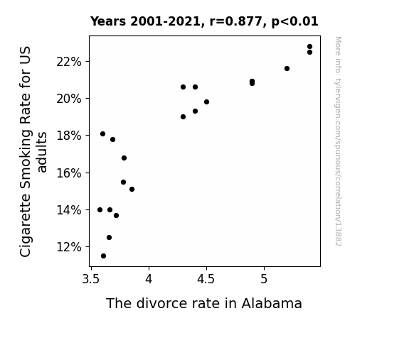 This means 76.9% of the change in the one variable (i.e., The divorce rate in Alabama) is predictable based on the change in the other (i.e., Cigarette Smoking Rate for US adults) over the 21 years from 2001 through 2021.