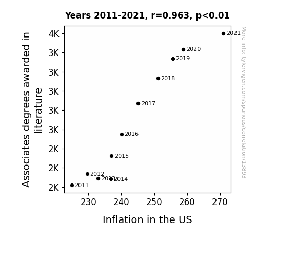 This means 92.8% of the change in the one variable (i.e., Inflation in the US) is predictable based on the change in the other (i.e., Associates degrees awarded in literature) over the 11 years from 2011 through 2021.