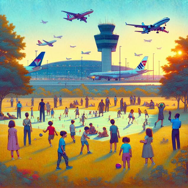 Prompt: Generate an image in a 3D Pixar Style of a serene park in Minnesota, where children are joyfully playing. The park is bordered by a bustling airport, with air traffic controllers skillfully guiding planes to land and take off in the background. The children look up in awe at the airplanes, reminiscing about their own childhood experiences. The scene conveys a heartwarming atmosphere of wonder and nostalgia. The depiction should include only scenes, people, and objects, it should not include text or speech bubbles.