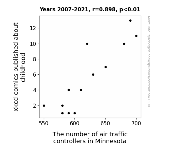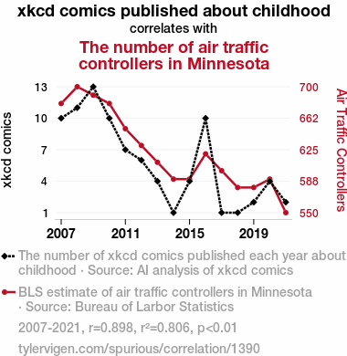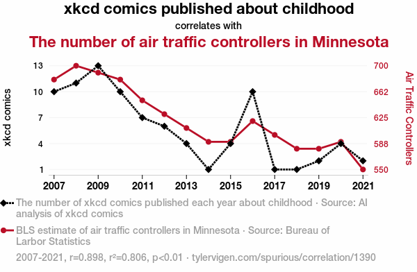 - The spurious research paper: The Xciting Correlation: A Statistical Analysis of xkcd Comics About Childhood and its Impact on Air Traffic Controller Numbers in Minnesota