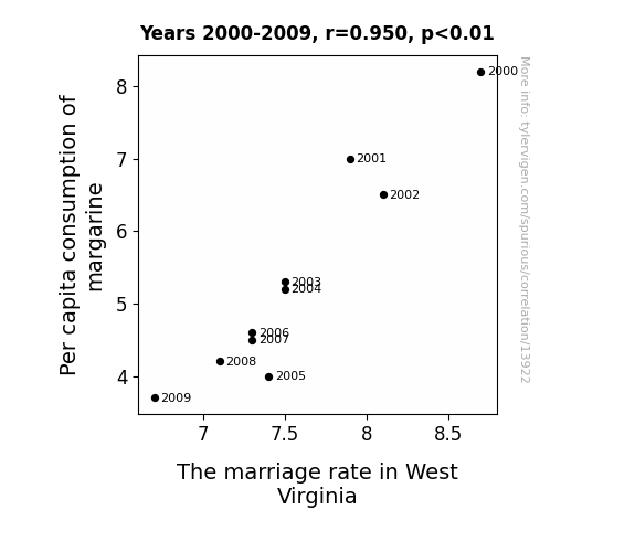 This means 90.2% of the change in the one variable (i.e., The marriage rate in West Virginia) is predictable based on the change in the other (i.e., Per capita consumption of margarine) over the 10 years from 2000 through 2009.