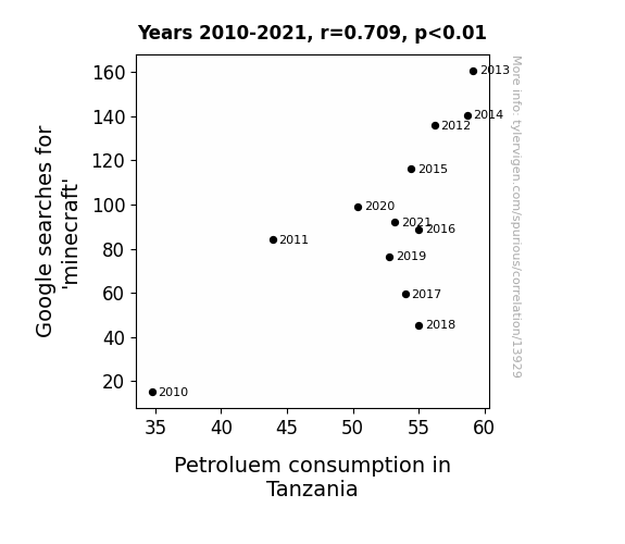 This means 50.2% of the change in the one variable (i.e., Petroluem consumption in Tanzania) is predictable based on the change in the other (i.e., Google searches for 'minecraft') over the 12 years from 2010 through 2021.