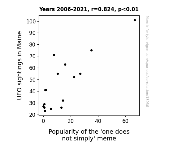 This means 67.9% of the change in the one variable (i.e., Popularity of the 'one does not simply' meme) is predictable based on the change in the other (i.e., UFO sightings in Maine) over the 16 years from 2006 through 2021.
