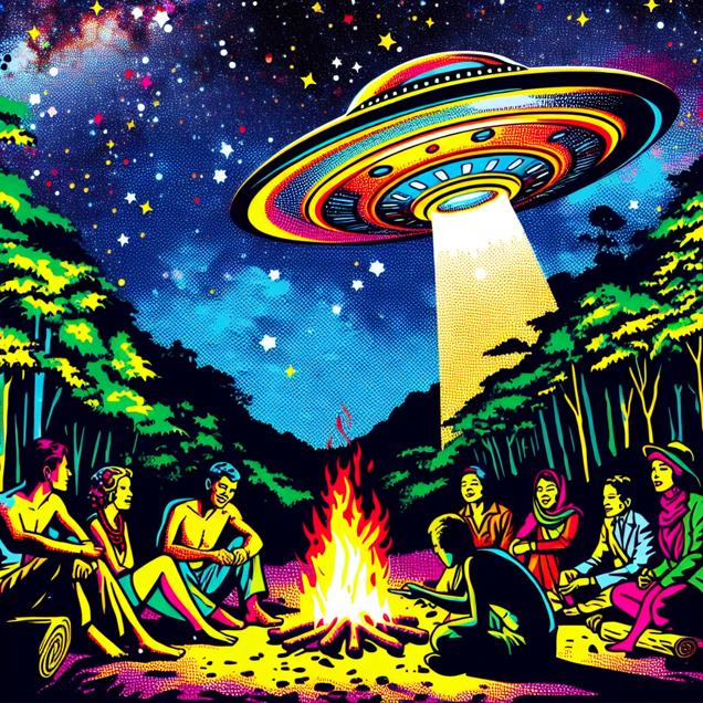 Prompt: "UFO sightings in Ohio: Pop art" - Generate an image incorporating the theme of UFO sightings in Ohio within a pop art style. Depict a vibrant and stylized scene in a lush Ecuadorian forest, where a group of people gathers around a campfire. A bright, otherworldly UFO hovers in the night sky, evoking the reported strange sighting in Ohio. The colors should be bold and dynamic, with a focus on creating a visually striking composition. Capture the essence of both the serene forest setting and the enigmatic presence of the UFO, infusing the image with a sense of wonder and intrigue. The depiction should include only scenes, people, and objects, it should not include text or speech bubbles.