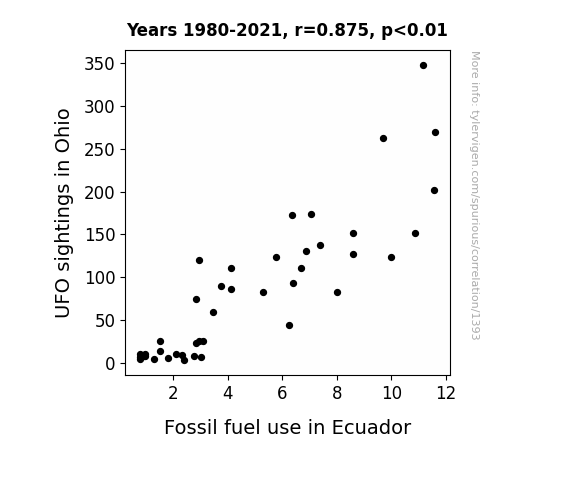 This means 76.6% of the change in the one variable (i.e., Fossil fuel use in Ecuador) is predictable based on the change in the other (i.e., UFO sightings in Ohio) over the 42 years from 1980 through 2021.