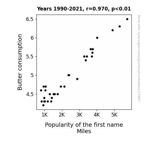 This means 94% of the change in the one variable (i.e., Popularity of the first name Miles) is predictable based on the change in the other (i.e., Butter consumption) over the 32 years from 1990 through 2021.
