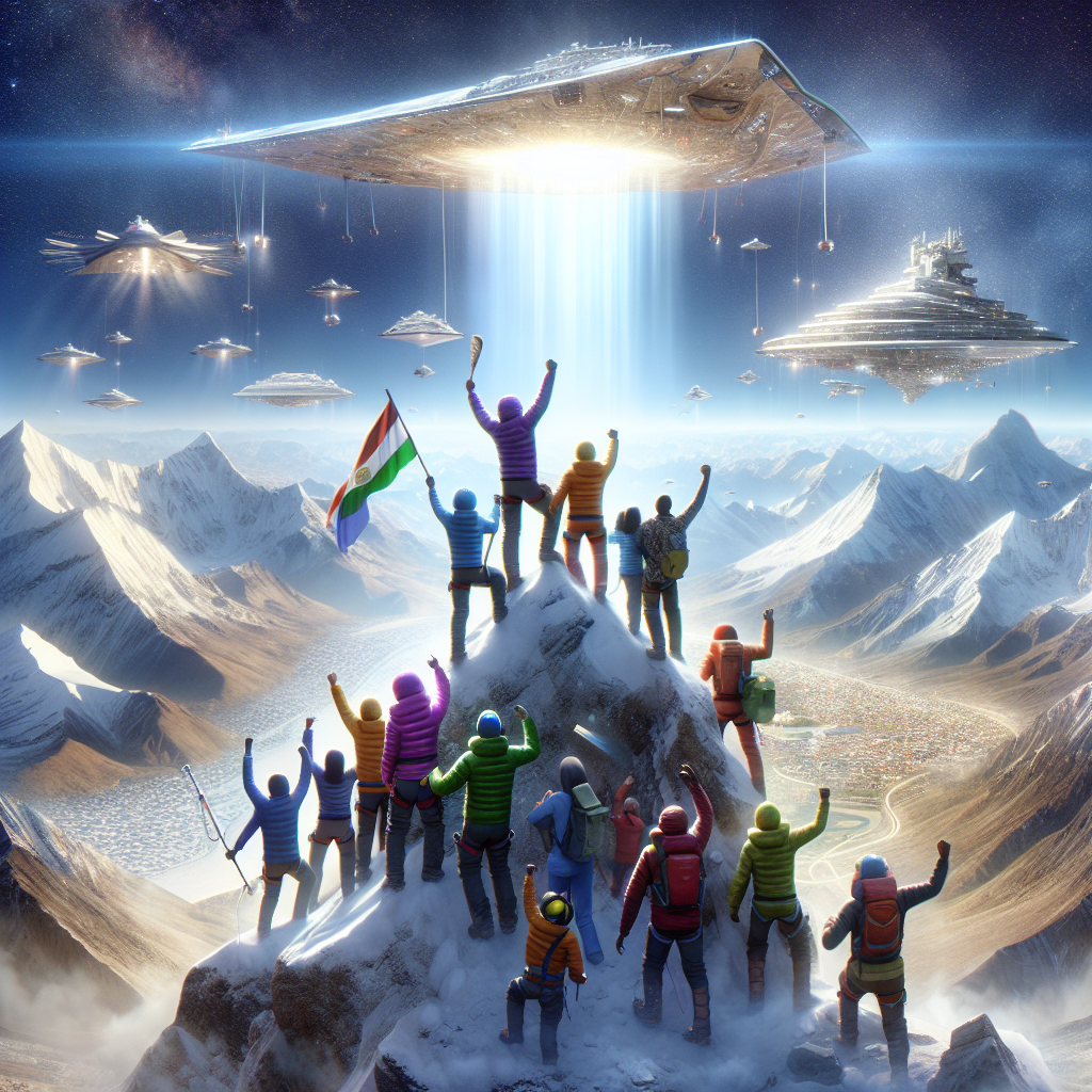 ChatGPT: A group of climbers triumphantly reaches the summit of Mount Everest, waving flags and celebrating their successful ascent, while in the distant sky, a mysterious UFO hovers over the landscape of Missouri, caught in a beam of light as witnesses look on in amazement.