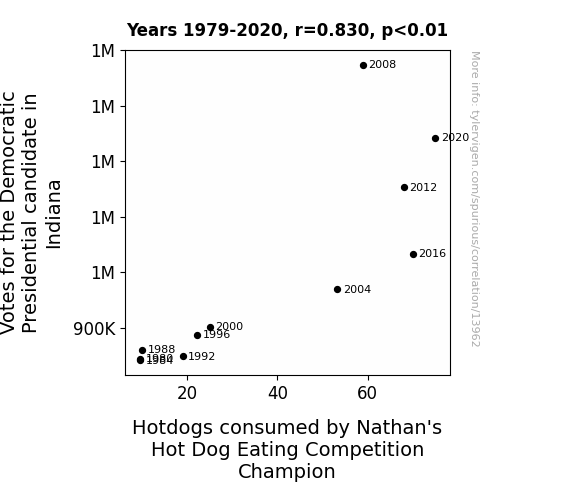 This means 68.8% of the change in the one variable (i.e., Hotdogs consumed by Nathan's Hot Dog Eating Competition Champion) is predictable based on the change in the other (i.e., Votes for the Democratic Presidential candidate in Indiana) over the 11 years from 1979 through 2020.