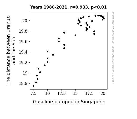 This means 87.1% of the change in the one variable (i.e., Gasoline pumped in Singapore) is predictable based on the change in the other (i.e., The distance between Uranus and the Sun) over the 42 years from 1980 through 2021.