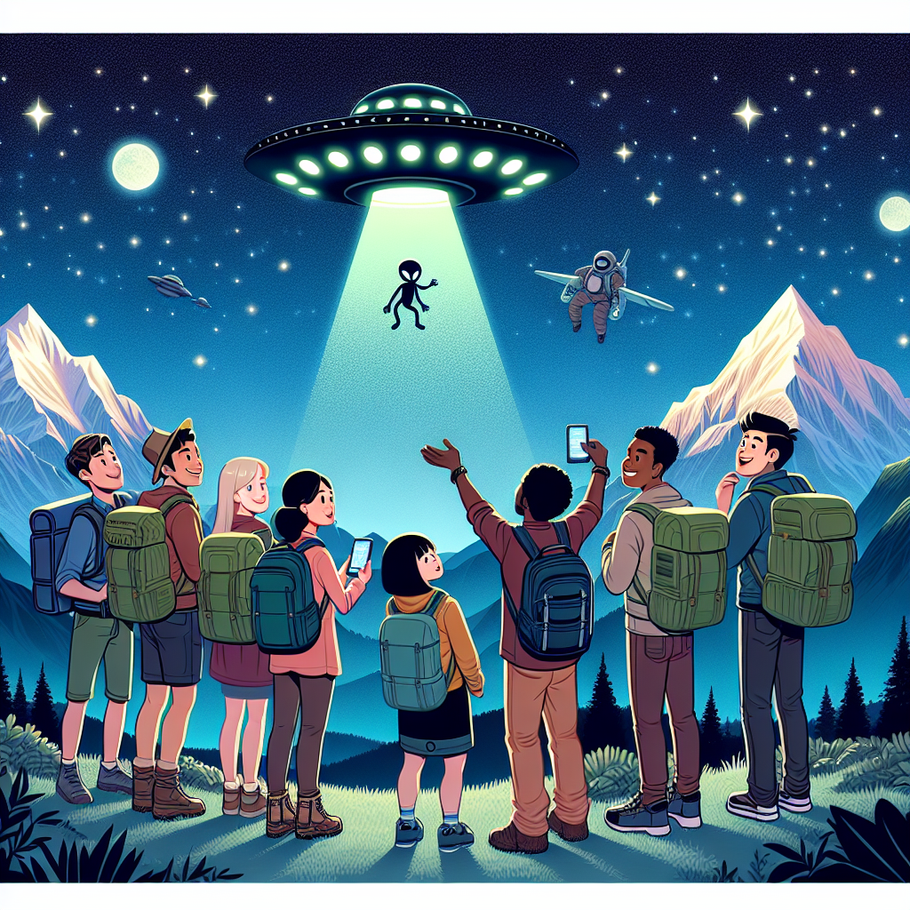 User prompt: Please respond with an image generation prompt that would be likely to create an interesting visual using DALLE-3, using the following style: [ Cute cartoon ] and depicting this scene: In the serene Blue Ridge Mountains of Virginia, a group of hikers observe a shimmering UFO hovering in the night sky, while on the distant, towering peaks of Mount Everest, triumphant climbers raise their arms in celebration of a successful ascent. Keep the visual depiction simple. Do not include any words or speech bubbles.