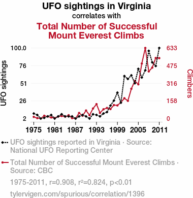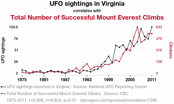 - The spurious research paper: Out of This World Connections: Exploring the Correlation between UFO Sightings in Virginia and Total Number of Successful Mount Everest Climbs