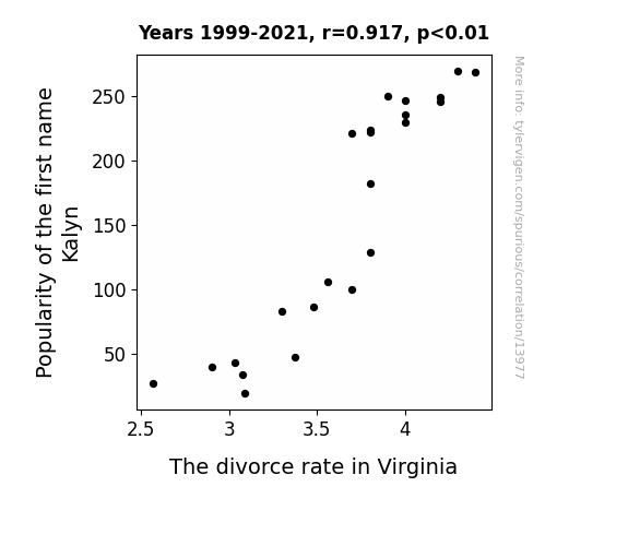 This means 84.1% of the change in the one variable (i.e., The divorce rate in Virginia) is predictable based on the change in the other (i.e., Popularity of the first name Kalyn) over the 23 years from 1999 through 2021.
