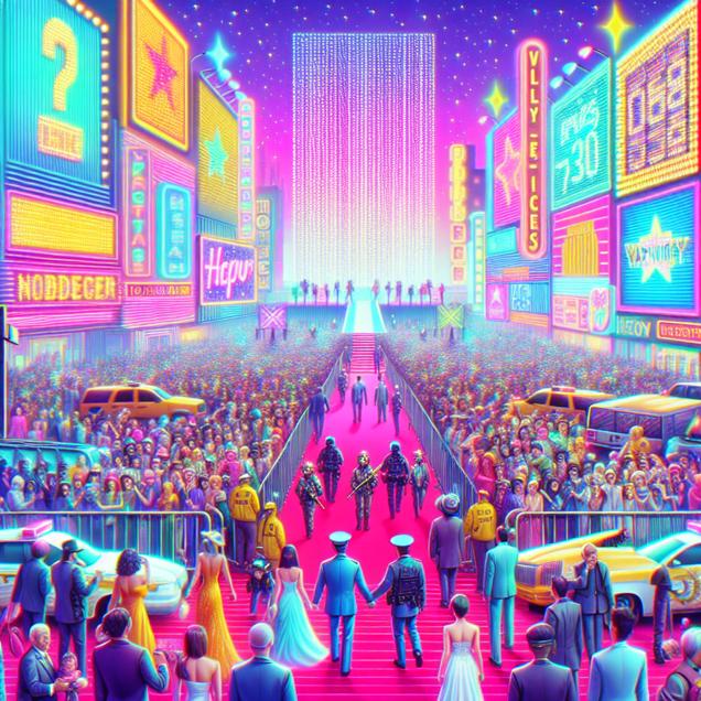 User prompt: Please respond with an image generation prompt that would be likely to create an interesting visual using DALLE-3, using the following style: [ Vaporwave ] and depicting this scene: A bustling movie premiere in Hollywood with a red carpet event, where the flashing lights of cameras capture the excitement of celebrities and fans from around the world. In the background, a large digital billboard displays the number of movies released annually, while clusters of tourists with different flags and languages can be seen taking photos and soaking in the glamor of Tinseltown. Keep the visual depiction simple. Do not include any words or speech bubbles.