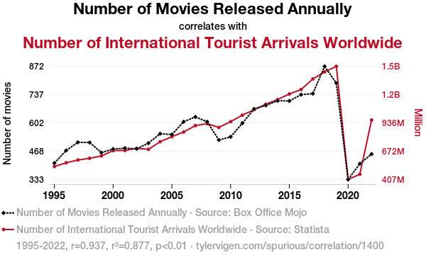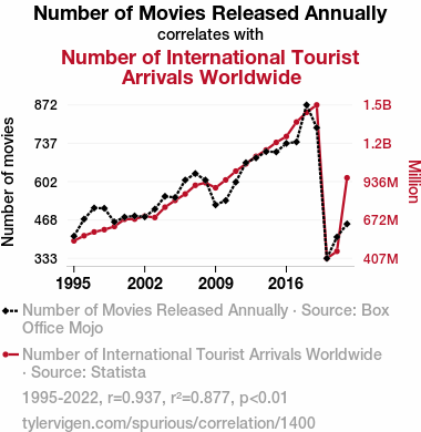 This means 87.7% of the change in the one variable (i.e., Number of International Tourist Arrivals Worldwide) is predictable based on the change in the other (i.e., Number of Movies Released Annually) over the 28 years from 1995 through 2022.