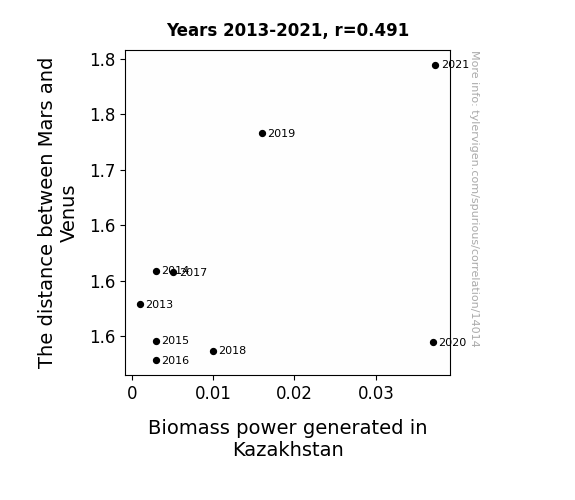 This means 24.1% of the change in the one variable (i.e., Biomass power generated in Kazakhstan) is predictable based on the change in the other (i.e., The distance between Mars and Venus) over the 9 years from 2013 through 2021.