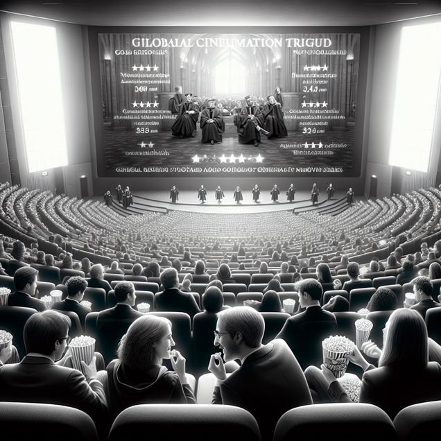 Prompt: Generate a black-and-white newspaper illustration of a bustling movie theater in Wisconsin. Picture a group of university communications teachers, identifiable by their scholarly attire, sitting together in the center of the theater. They are engrossed in the Harry Potter movie marathon, popcorn in hand, engaged in lively discussion about the film's storytelling techniques. The giant digital screen at the front of the theater displays impressive worldwide revenue statistics earned by the Harry Potter movies. The scene captures the convergence of global movie success and academic discourse, showcasing the impact of popular culture on scholarly conversations. The depiction should include only scenes, people, and objects, it should not include text or speech bubbles.