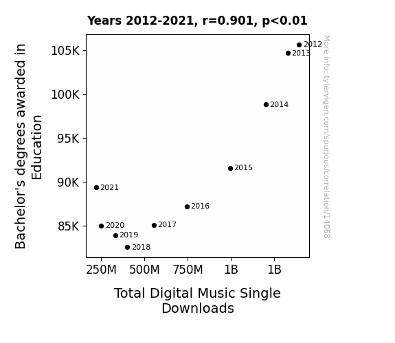 This means 81.2% of the change in the one variable (i.e., Total Digital Music Single Downloads) is predictable based on the change in the other (i.e., Bachelor's degrees awarded in Education) over the 10 years from 2012 through 2021.