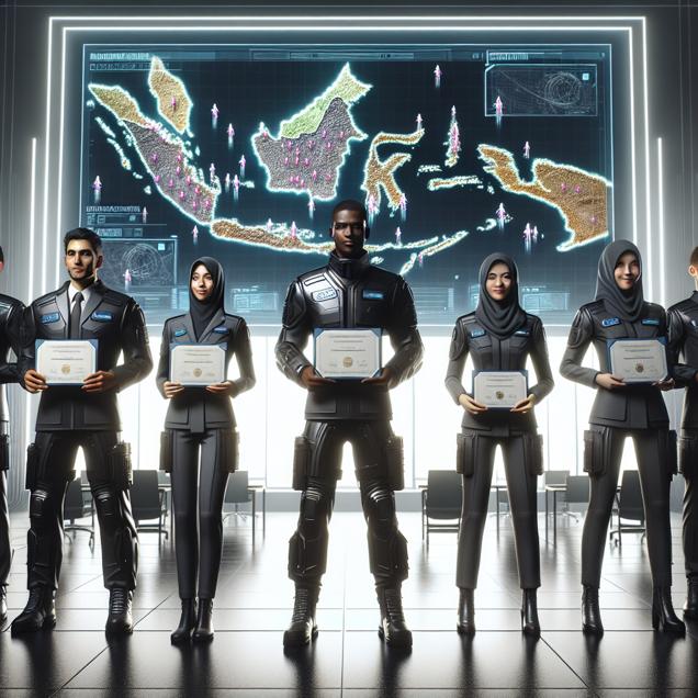 Prompt: Generate an image of a futuristic scene featuring a group of students wearing sleek security uniforms. They stand proudly holding their Associate's degree certificates. In the background stands a large, illuminated map of Indonesia, and dotted across the map are small symbolic pirate ships marked at various strategic locations. The scene should convey a sense of accomplishment and readiness to protect against unconventional threats in a future world. The depiction should include only scenes, people, and objects, it should not include text or speech bubbles.
