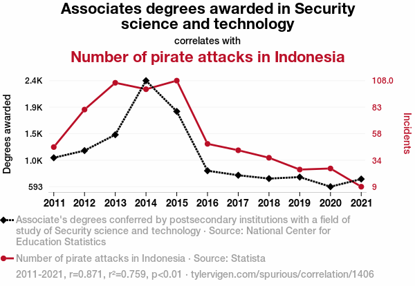 User prompt: Please provide potential search keywords for a paper titled Associates in Piracy: The Relationship Between Security Science and Technology Degrees and Pirate Attacks in Indonesia with an abstract of This study delves into the curious connection between the number of Associates degrees awarded in Security Science and Technology and the frequency of pirate attacks in Indonesia. Using data from the National Center for Education Statistics and Statista, our research team conducted a thorough analysis covering the period from 2011 to 2021. The correlation coefficient of 0.8709696 and p < 0.01 for this time frame unveiled a surprisingly strong relationship between the two variables.