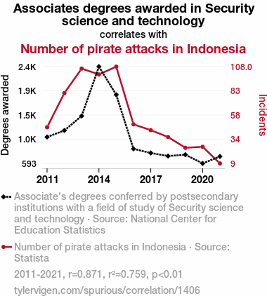 This means 75.9% of the change in the one variable (i.e., Number of pirate attacks in Indonesia) is predictable based on the change in the other (i.e., Associates degrees awarded in Security science and technology) over the 11 years from 2011 through 2021.