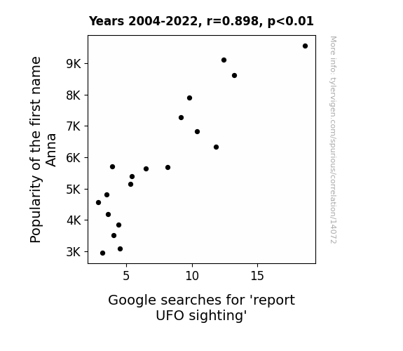 This means 80.6% of the change in the one variable (i.e., Google searches for 'report UFO sighting') is predictable based on the change in the other (i.e., Popularity of the first name Anna) over the 19 years from 2004 through 2022.