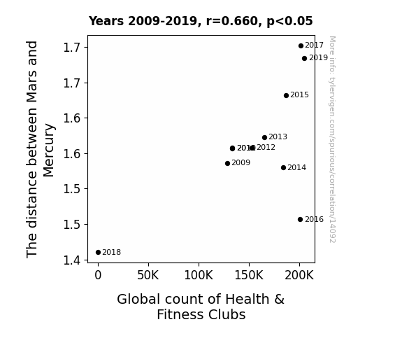 This means 43.6% of the change in the one variable (i.e., Global count of Health & Fitness Clubs) is predictable based on the change in the other (i.e., The distance between Mars and Mercury) over the 11 years from 2009 through 2019.